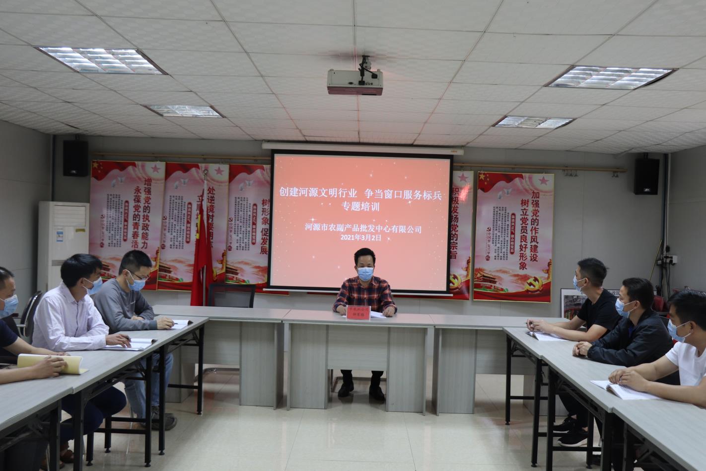 河源市農(nóng)副產(chǎn)品批發(fā)中心有限公司積極響應(yīng)河源市文明委關(guān)于開展文明行業(yè)創(chuàng)建的號召,于2021年3月2日在公司會議室開展“創(chuàng)建河源文明行業(yè),爭當(dāng)窗口服務(wù)標(biāo)兵”專題培訓(xùn),市農(nóng)批中心三鳥交易區(qū)(三鳥市場)的窗口服務(wù)人員全部參加了培訓(xùn)。